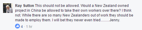 “这不应该被允许!如果新西兰企业在中国开发一个地产项目,中国有可能允许新西兰企业把新西兰的劳工带到中国吗?我认为不会。目前在新西兰有很多失业者,难道不应该雇佣他们吗?”