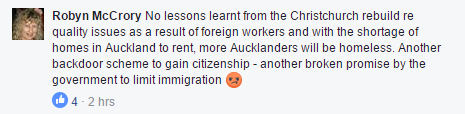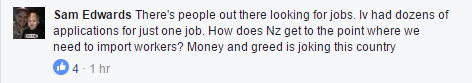 “现在有很多新西兰人都没有工作,很多人不得不争抢一份工作机会。为什么我们还要从海外引进劳工呢?金钱和贪婪毁掉了我们这个国家。”